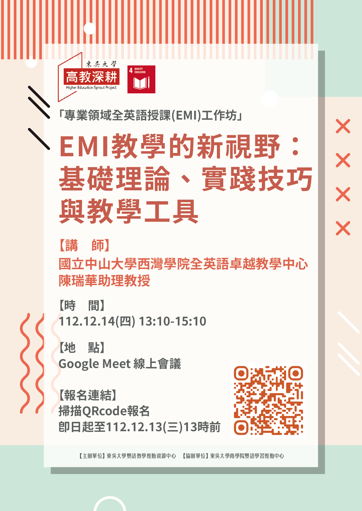 【轉知】東吳大學辦理「專業領域全英語授課(EMI)工作坊」,歡迎師長報名參加。