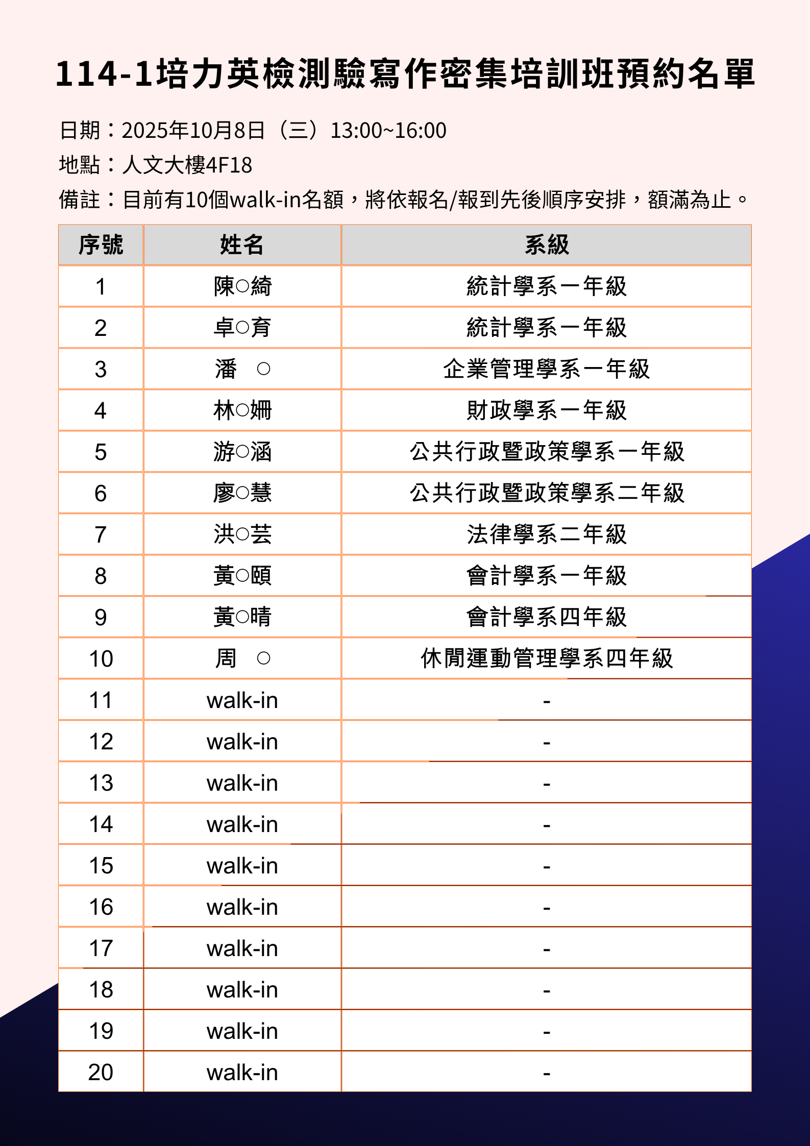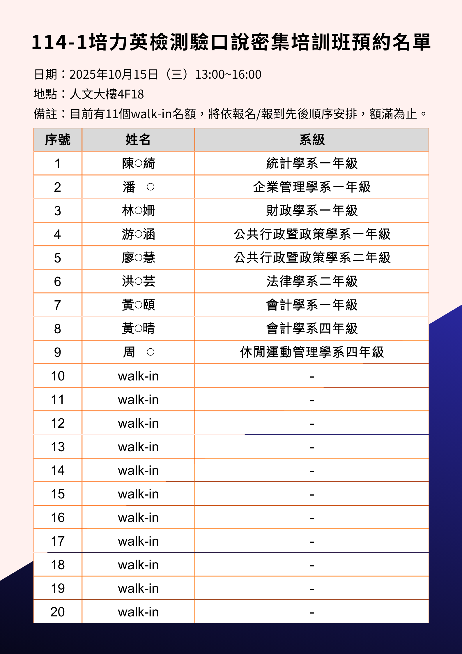 114-1 培力英檢測驗口說、寫作密集培訓班預約名單公告,有名額的場次,歡迎有興趣的同學 walk-in~