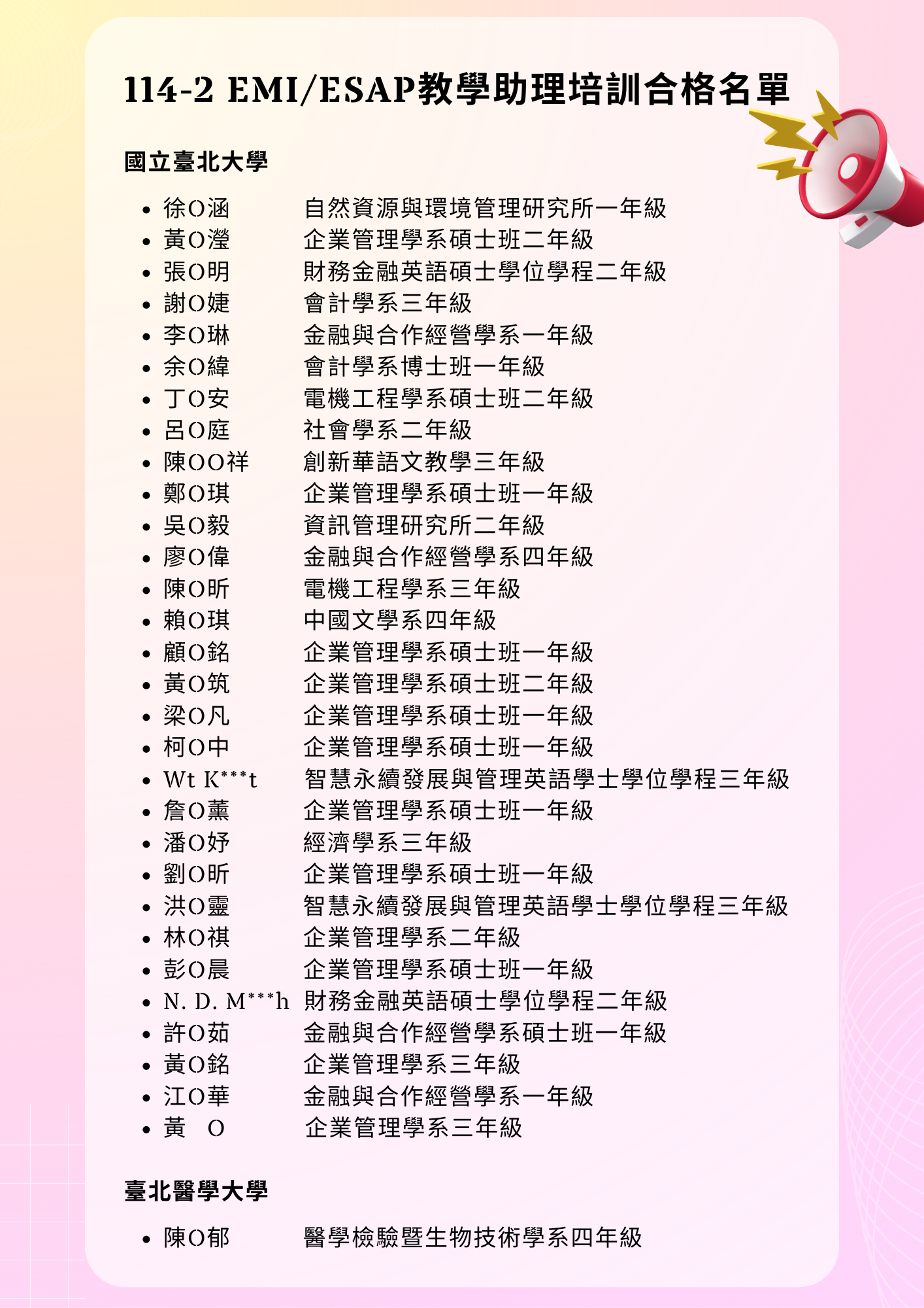 【114-2 EMI/ESAP 教學助理培訓】合格名單出爐啦~