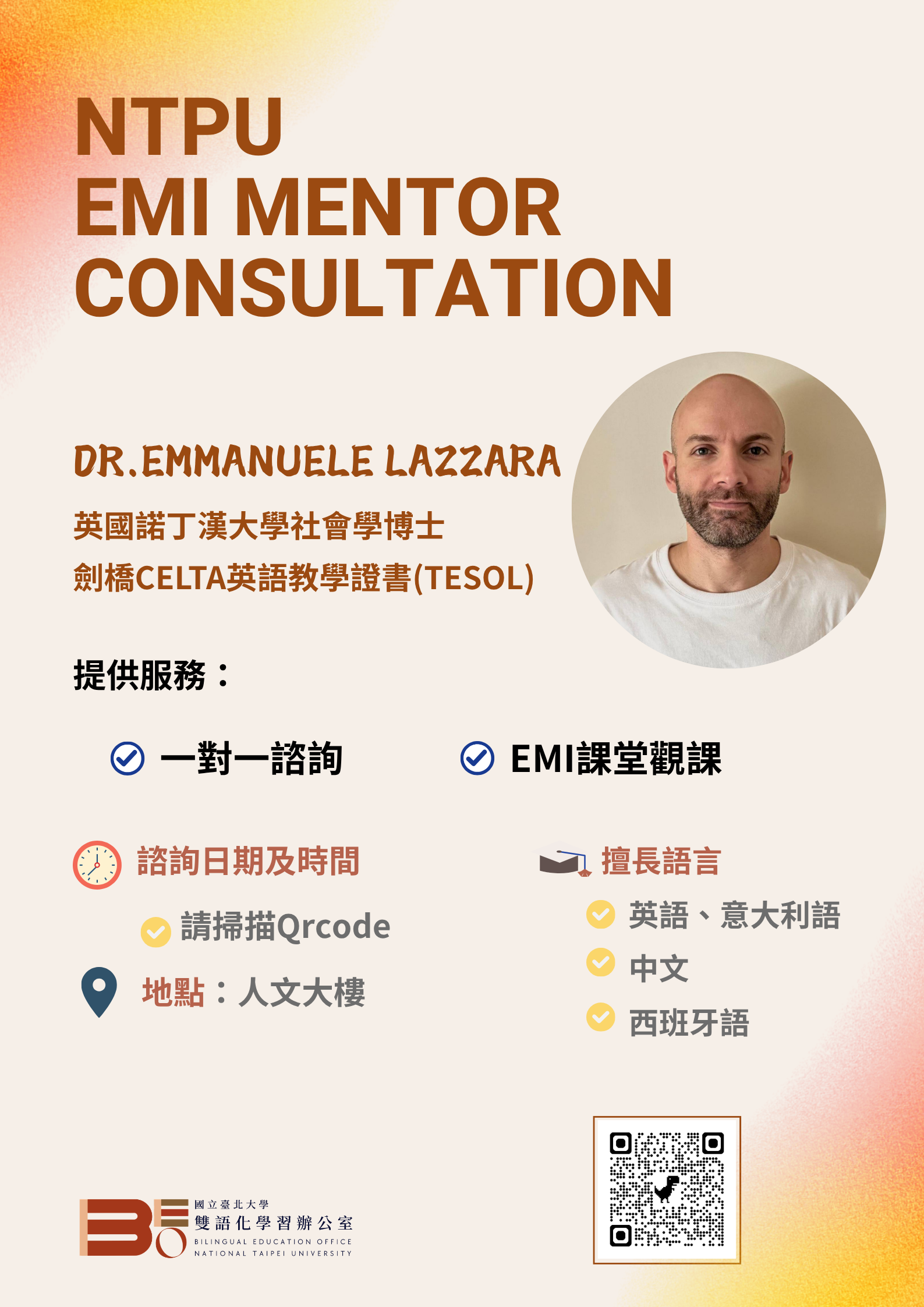 本學期EMI Mentor為英國諾丁漢大學社會學博士Emmanuele Lazzara,他擁有豐富的國際教學經驗,在語言教學、課程設計、學術寫作指導等方面有豐富經驗,並能以流利的英語、意大利語及中文進行溝通。歡迎您來預約。
